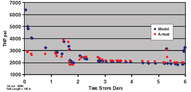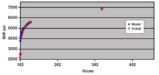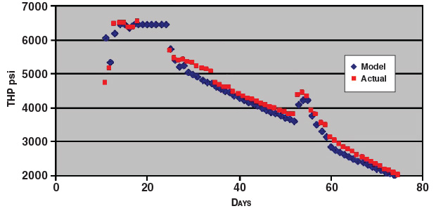 Figure 1 shows a case where flow rates were used as the control to predict wellhead (tubing) pressures for a high-pressure, low-permeability reservoir. The reservoir was modeled with a high level of confidence in the original parameters. However, after adjusting reservoir volume to get a flowing tubing pressure match with the first six days’ worth of data, the size of the reservoir was found to be smaller than expected. A closer subsequent geological evaluation indicated that all of the production could be coming from a small isolated compartment within the main reservoir. The model was run to predict well performance during the next two months and the results matched the observed data extremely well.