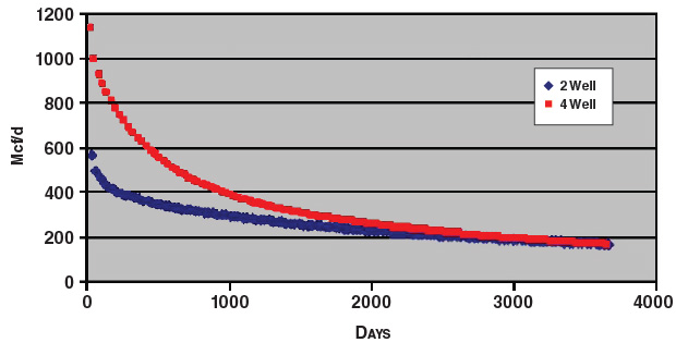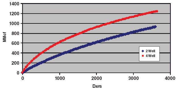 When the flow differential between these two cases was plotted, it was found that virtually all of the additional production was realized within the first 3.5 years. After that, each section would yield about the same amount of gas regardless of whether two or four wells were drilled (Figure 3B). This insight brought into sharp focus the true nature of the drilling decision. After running several other field development cases, the operator was able to determine the optimum spacing pattern and completion methods that would allow the field to be drained with only two wells per section, saving millions in drilling and development costs.