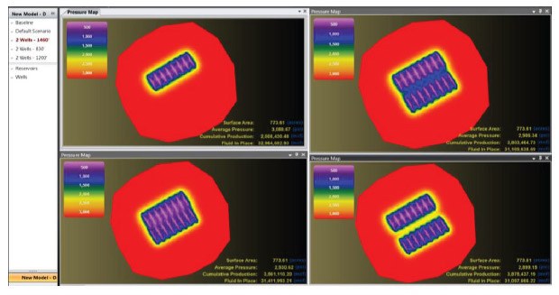 The maps in Figure 4B show the distribution of pressure in the reservoir at the end of each model run (25 years). Significant well-to-well pressure communication is seen in the 750-foot spacing scenario, with pressure interference diminishing as spacing increases. Cumulative production is shown at the bottom right of each map. Based on the modeling, it was possible to rapidly evaluate many different field development options before committing hard dollars to a final plan.