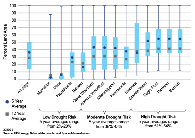 An analysis of drought data from the National Oceanic and Atmospheric Administration (NOAA) to assess play-level water stress, combined with data on completion activity, shows that 79 percent of completion activity is taking place in areas that have faced moderate or high drought risk over the past 10 years. Figure 1 shows the land area in 13 high-activity unconventional plays impacted by drought.