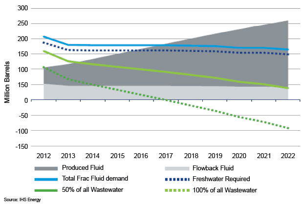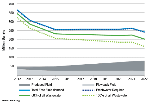 In contrast to the Eagle Ford, the required fracture fluid volume in the Permian is less than a quarter of the volume of wastewater generated in the play. Wastewater in the Permian is heavily dominated by produced water from a long established base of producing wells in conventional resources. At the macro level within the Permian, there are ample wastewater supplies available to reduce source water requirements, but the quality is very poor and much of this fluid may already be accounted for by existing secondary recovery techniques within conventional fields. This means that reducing source water requirements by a notable percentage would require significant water treatment or fracture chemical modification, posing an expense to operators.