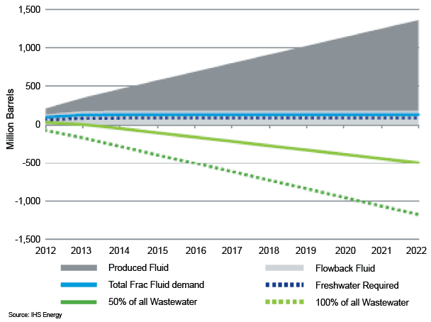 However, as the drought analysis in Figure 1 demonstrates, water supply risk is often localized to small areas over short periods. Marginal increases in water demand in areas that are already water stressed can impact other water users by increasing the frequency and severity of shortages. Therefore, water demand analysis at the play level (especially in play areas facing high drought risk) is more meaningful than at the national level. Figures 2, 3 and 4 show water use projections through 2022 for the Eagle Ford Shale, Bakken Shale and Mississippian Lime plays, respectively.