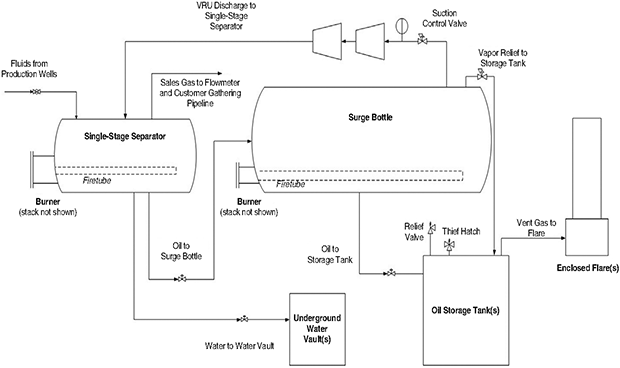 As peak oil production rates at individual sites trended up over the years as a result of horizontal drilling and improved fracturing techniques, the surge bottle-to-VRU and storage tank-to-flare became one of two preferred approaches. The other preferred approach swapped a VRT for the surge bottle.