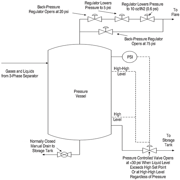 The control philosophy evolved over the course of the surge bottle’s development. For example, a higher pressure to vent gas from the surge bottle set point was used on systems where this gas fed a VRU to increase the capacity of the VRU, and a gas regulator was added on a vapor line from the separator to the surge bottle to keep a minimum pressure in the surge bottle and ensure oil would drain to the storage tank. Sites with electricity can use a pump to move the oil from the surge bottle to the storage tank at lower operating pressures in the surge bottle.