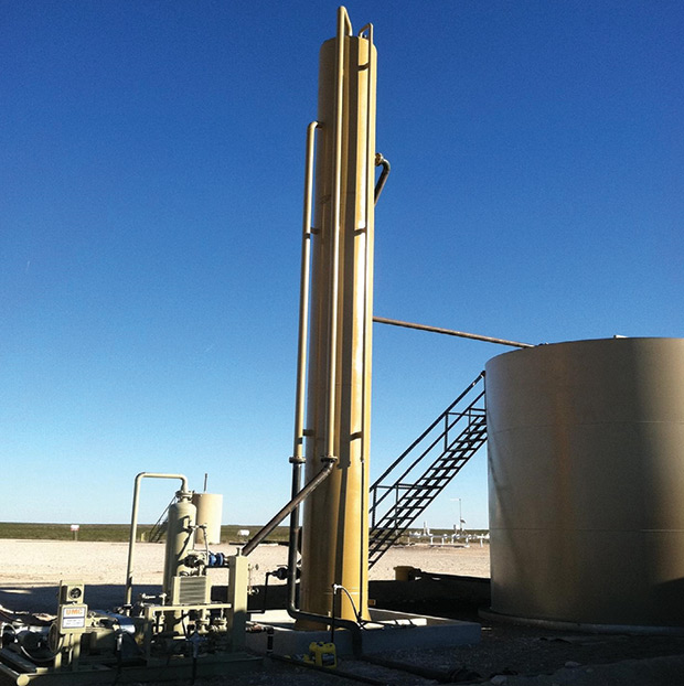 A VRT is usually installed between the separator and the storage tanks in a similar arrangement to a surge bottle. Oil dumps from the separator to the VRT and then from the VRT to storage tanks. As shown in Figure 3, a VRT for an oil and gas production site is a small-diameter vertical vessel that is 35-40 feet tall. It operates at very low pressure at the top of the tower (on the order of 3 psig).