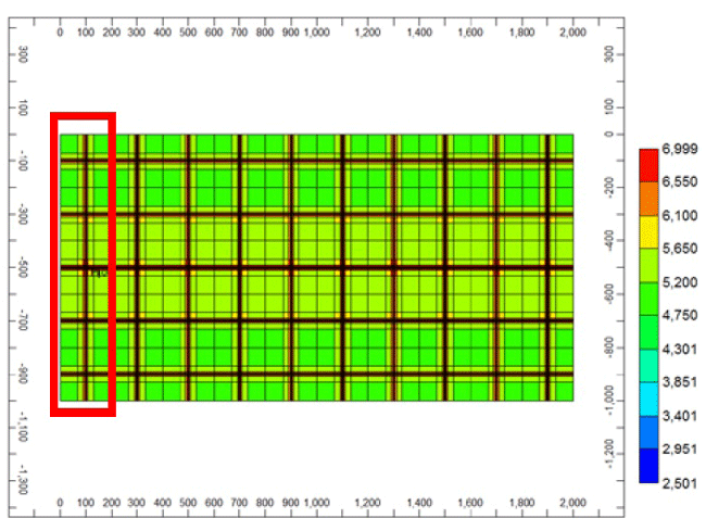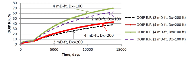 In the 0.001-foot wide fracture model, the local grid refinement consisted of a 21 by 21 log-spaced block grid to capture flow near the fractures with better resolution. The results of the first 1,800 days (five years) of primary production were compared to determine the validity of the technique. Simulation results for average reservoir pressure, oil recovery factor and oil production rate during primary production were compared. The LS-LR-DK model produced the same results as the refined 0.001 foot-wide fracture model: 5.5 percent oil recovery, with average reservoir pressure and oil rate matches during five years of primary production.