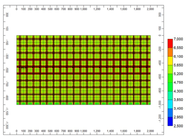The local grid refinement for each 200 by 200-foot large block in the SRV was made into nine by nine-foot logarithmically spaced smaller cells. This fine gridding accurately modeled the pressure drop in the regions adjacent to the fractures. A computationally efficient two-foot width was used to represent fluid flow in fractures. In the LS-LR-DK model, fracture network permeability was 2 millidarcies and reservoir permeability was 0.0001 mD. For each cell, it was assumed that a single 0.001-foot wide fracture ran through the 200-foot long block, for an average fracture porosity of 0.0005 in the two-foot wide cells.