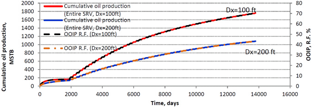 Figure 2 compares the production profiles for network fractures spaced at 200 and 100 feet. After 60 cycles, oil recovery increased to 45 percent of ultimate oil recovery for 200-foot fracture network spacing and 70 percent of ultimate oil recovery for 100-foot spacing. (The higher secondary recovery at smaller spacing was the result of assuming the entire reservoir was in the SRV and connected by the fracture network. A more realistic case was later investigated by including the non-SRV).