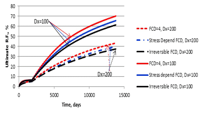 Figure 4 illustrates that stimulated fracture network density has a more significant effect on improving recovery in oil shales than stress-dependent conductivity. The oil recovery from 100-foot fracture network spacing was constantly higher than at 200-foot spacing regardless of conductivity changes. For the 100-foot spacing fracture network, oil recovery lost by the irreversible reduction of conductivity was roughly 10 percent versus no stress effect.