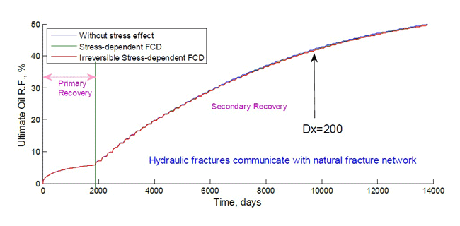 The simulation results show that in the uniform conductivity of the unpropped fracture network, oil production from shale reservoirs is impacted by reduced natural fracture conductivity caused by stress effects, resulting in lower recovery. However, the presence of highly conductive propped hydraulic fractures that connect to the natural fractures can compensate for that recovery loss by reducing the stress effect on network fracture conductivity.