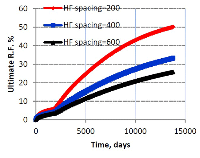 The relationship between fracture spacing and well performance is illustrated in Figure 7A, with the results again indicating that hydraulic fracture spacing is the dominant factor dictating reservoir drainage area and well performance. As shown in Figure 7B, ultimate oil recovery from a planar hydraulic fracture is approximately 30 percent with gas huff-and-puff. Ultimate oil recovery from the hydraulic fracture connected to the natural fracture system is the highest (20 percent more recovery than the propped fracture). There is less production difference between the fracture network connected to the hydraulic fracture system and the purely fractured network, underscoring the importance of fracture density to connect hydraulic and natural fractures.