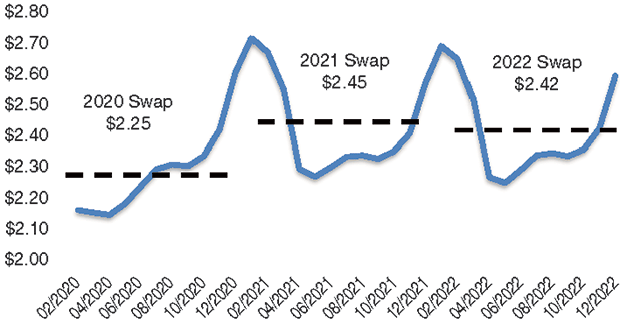 As an example of this strategy, assume that the current NYMEX swap prices are $2.25/MMBtu and $2.45/MMBtu for calendar years 2020 and 2021, respectively (Figure 1). Rather than hedging with swaps at these prices, a company may decide that it would rather sell an option giving the counterparty the right to enter into a swap for 2021 at $2.50/MMBtu (commonly referred to as a “swaption”). When this option expires in December 2020 (or whichever expiry date is negotiated), if the swap price is above $2.50/MMBtu, the bank will execute its right to swap at $2.50/MMBtu. If the price is below $2.50/MMBtu, the bank will not swap.