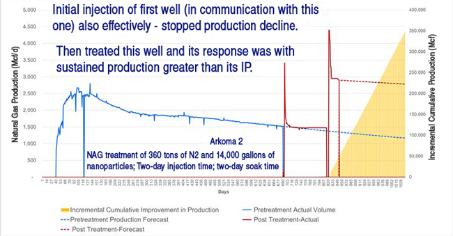 Prior to treatment, the Arkoma 2 had produced 1,300 Mcf/d of gas and 6 bbl/d of oil. The well’s IP had been about 2,600 Mcf/d. After the full 2-day NAG treatment with 360 tons of N2 and 14,000 gallons of nanoparticles (which had to be injected through Arkoma 1 because of production tubing issues with the well), Arkoma 2 responded with sustained production 120% greater than its IP. Arkoma 1 continues to achieve sustained daily gas production levels of 2,200 Mcf/d, well above its pretreatment production of 1,300 Mcf/d.