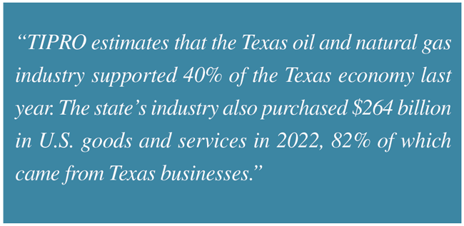 In 2022, the report continues, total direct gross regional product for the Texas oil and natural gas industry was $323 billion, or 16% of the Texas economy. Citing the typical multiplier effect of 2.5%, TIPRO estimates that the Texas oil and natural gas industry supported 40% of the Texas economy last year. The state’s industry also purchased $264 billion in U.S. goods and services in 2022, 82% of which came from Texas businesses.