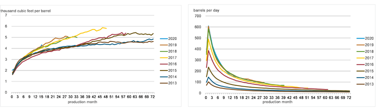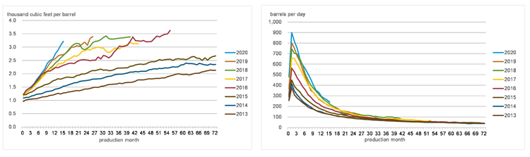 Note: Each curve represents average GOR of all wells starting production in a given year. Each curve represents average oil production of all wells starting production in a given year.