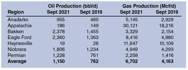 Compared to September 2019, new-well production climbed from 762 bbl/d to 1,150 bbl/d while new-well natural gas production per rig soared from 4,163 to 6,702 Mcf/d. Significant productivity gains were recorded across the board in every tight oil play, led by a 73% increase in the Eagle Ford, 63% in the Bakken, 61% in the Permian, 48% in the Anadarko, and 46% in the Niobrara (Table 1).