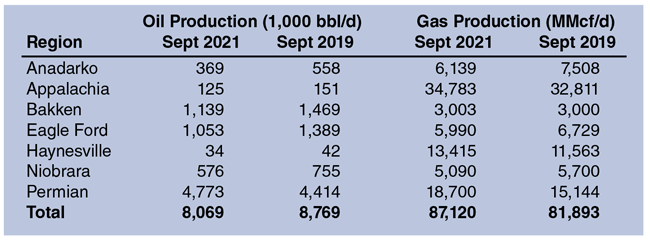 Looking at production totals from the “Big Seven” U.S. shale regions (Table 2), EIA data indicate that oil output in September still lagged September 2019 by 700,000 bbl/d. Oil production was down in every region compared to two years ago except the Permian, where it grew by 359,000 bbl/d.
