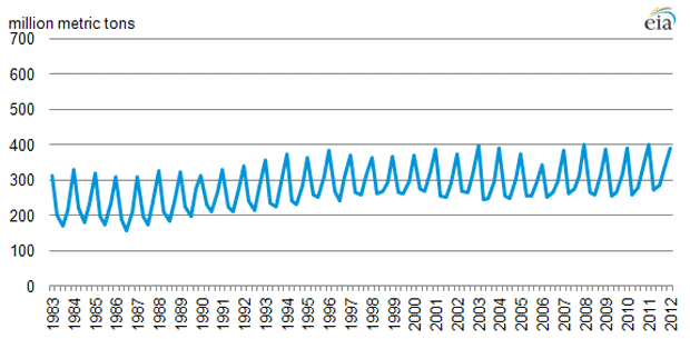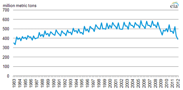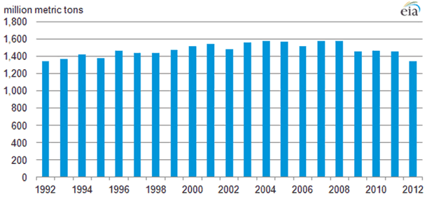 Figure 1 shows first-quarter U.S. CO2 emissions from energy production between 1992 and 2012, as reported by the EIA. On an annual basis, U.S. energy-related carbon dioxide emissions peaked in 2007-08, and have declined since to the point where full-year 2012 emissions are expected to approach the 5 billion metric tons of 1990.