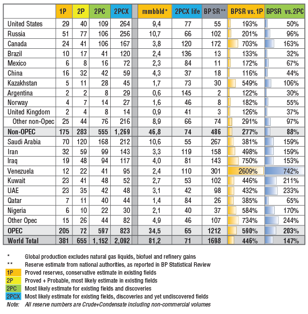 Ranking nations by the most likely estimate for existing fields, discoveries and as-of-yet undiscovered fields (proved, probable. possible and undiscovered), the United States is at the top of the list with 264 billion barrels of recoverable oil reserves, followed by Russia with 256 billion, Saudi Arabia with 212 billion, Canada with 167 billion, Iran with 143 billion, and Brazil with 120 billion (Table 1).