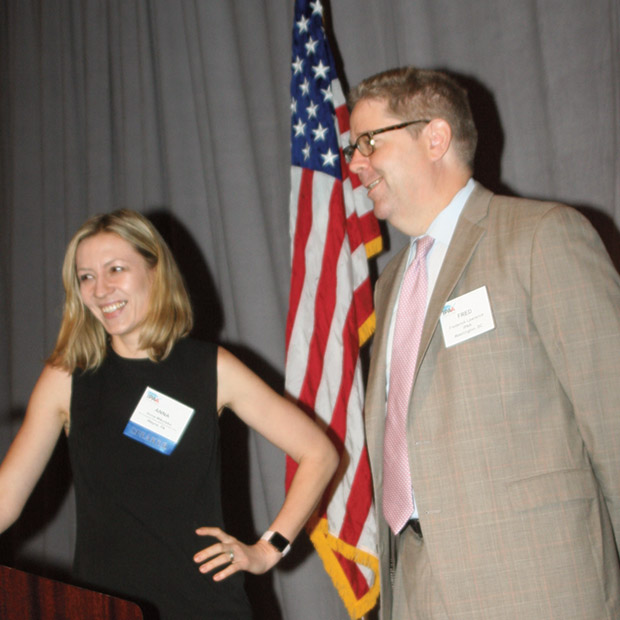 Independent Petroleum Association of America Vice President of Economics and International Affairs Fred Lawrence chats with geopolitical energy expert Anna Mikulsa before her remarks at IPAA’s 2018 midyear meeting, held June 25-26 at the Hyatt Regency Lost Pines outside Austin, Tx. During her presentation, Mikulska indicated that eastern European countries merely needed the capability to import liquefied natural gas to help prevent Russia from misusing its energy exports to achieve political ends.