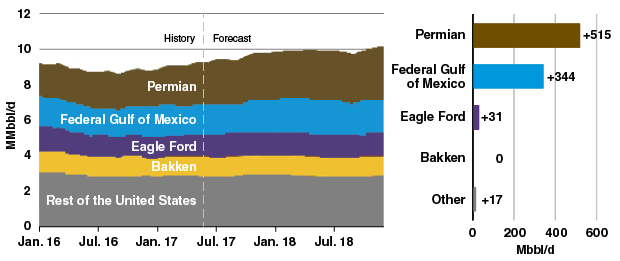 In its July Short-Term Energy Outlook (STEO), the agency reported that total U.S. crude oil production was on track to average 9.3 million bbl/d this year, which would represent an increase of 500,000 bbl/d over 2016. EIA says most of the growth in U.S. oil production through the end of 2018 is forecast to come from tight rock formations in the Permian Basin as well deepwater fields in the Gulf of Mexico (Figure 1).