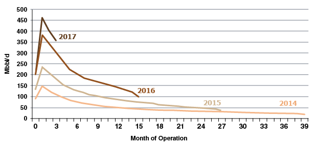 Average output per well shows that productivity based on initial production rates continues to increase in the Permian Basin (Figure 2). Year-to-date initial production based on average output per well is higher than the 2016 annual average, according to EIA. “Many operators are continuing to experiment with completion techniques to maximize output per well, suggesting the 2017 annual average initial production rate could continue to increase,” the agency says.