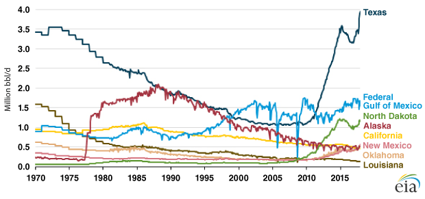 After declining by 551,000 barrels a day in 2016, U.S. oil production increased by 464,000 bbl/d in 2017, reaching an average of 9.3 million bbl/d on an annualized basis, only 0.3 million bbl/d shy of the all-time peak of 9.6 million bbl/d attained in 1970. By November, EIA says monthly U.S. crude oil production had hit 10.07 million bbl/d, representing the highest monthly oil production level in history. The agency projects that oil output will , averaging 10.7 million and 11.3 million bbl/d, respectively–easily surpassing 1970’s historic annual peak.
