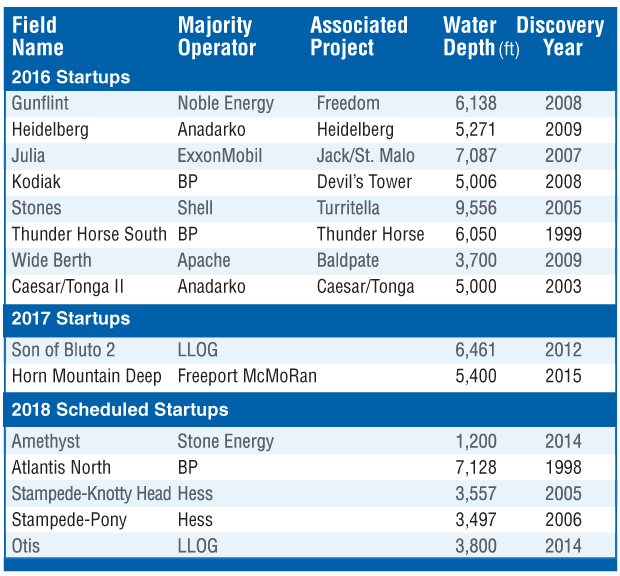 In the federal waters of the Gulf of Mexico, a number of new deepwater projects and expansions that achieved first oil in 2016 helped ramp 2017 production. Along with two other fields that commenced production last year, these projects contributed to 51,000 bbl/d of year-over-year growth to reach the highest annual average crude oil production from the federal Gulf of Mexico, making it the second largest producing region in 2017 behind Texas. Five more deepwater fields are scheduled to begin production this year (Table 1).