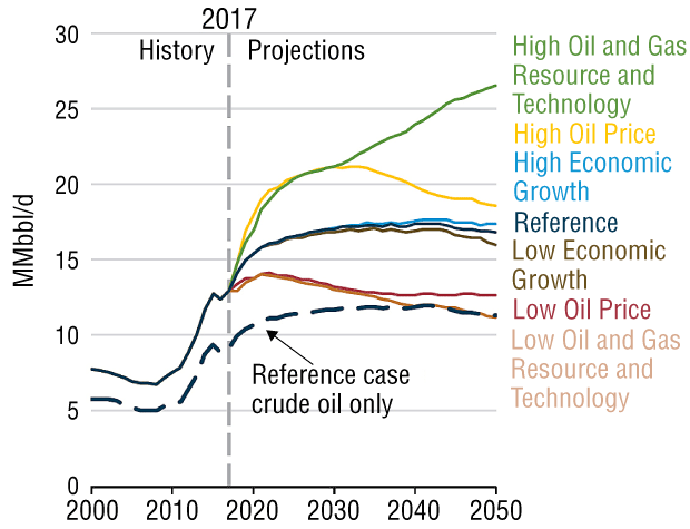 In the AEO, however, EIA says it sees post-2019 domestic production leveling off and then remaining relatively flat over the longer term. “Lower-48 onshore tight oil development continues to be the main driver of total U.S. crude oil production, accounting for about 65 percent of cumulative domestic production in the reference case over the projection period to 2050,” the AEO states. “Reference-case U.S. crude oil production levels off between 11.0 million and 12.0 million barrels a day as tight oil development moves into less productive areas and as well productivity declines.”