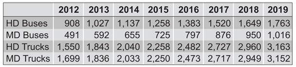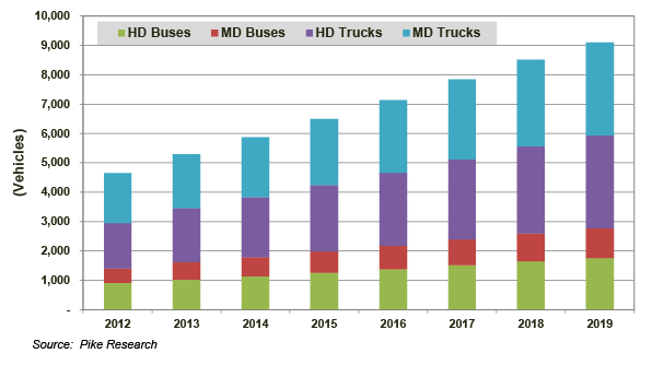 The pieces are falling into place for robust NGV growth in the United States, but the markets for MD and HD trucks and buses are still in their early stages. Pike Research expects the market to see 10 percent compound annual growth in natural gas-fueled trucks between 2012 and 2019. This translates into a market growing from 3,250 MD and HD natural gas trucks expected to sell this year to almost doubling to 6,315 by 2019. Similarly, the bus market in the United States is anticipated to essentially double from 1,399 vehicles this year to 2,778 in 2019 (Table 2).