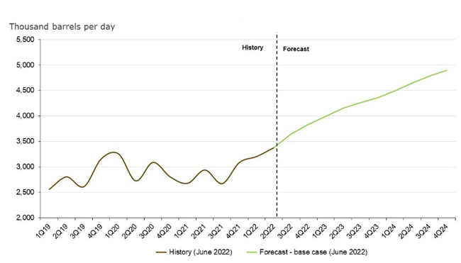 “The future looks bright for Gulf Coast exports, with volumes transiting through the hubs of Corpus Christi, Houston and Beaumont, Port Arthur and Louisiana expected to accelerate in the coming years. Under Rystad Energy’s base case scenario, crude exports will approach 4 MMbbl/d in the first three months of 2023 and break the 4 MMbbl/d barrier by the second quarter of 2023, thanks to strong SPR draws and a rosy domestic supply outlook,” the firm projects (Figure 3).