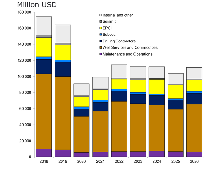 Figure 1 shows forest U.S. oil and gas capital expenditures by segment. Overall, Rystad projects that U.S. spending will rebound from $91 billion in 2020 to an expected $99 billion this year, and then to the $112 billion range in 2022. Although strong oil prices indicates a more favorable economic outlook, the growth of EPCI costs is a cause for concern for oil and gas operators in the near term, according to Rystad.