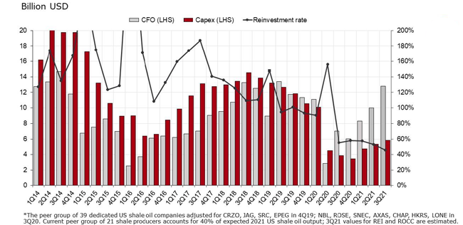 The peer group’s combined reinvestment rate in the third quarter was 46%, down from 53% over the same period in 2020 and far lower than the historical average of 130% (Figure 2). The reinvestment rate is calculated by comparing shale producers’ oil and gas CAPEX budgets against their cashflows from operations (CFO). The CFO of the last quarter was the strongest since the second quarter of 2019.