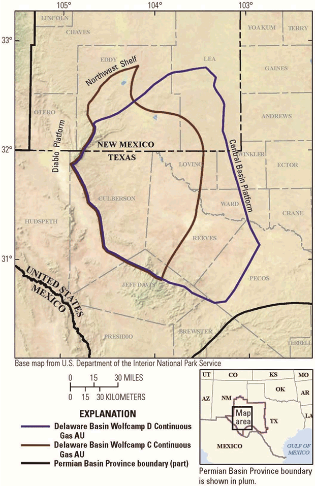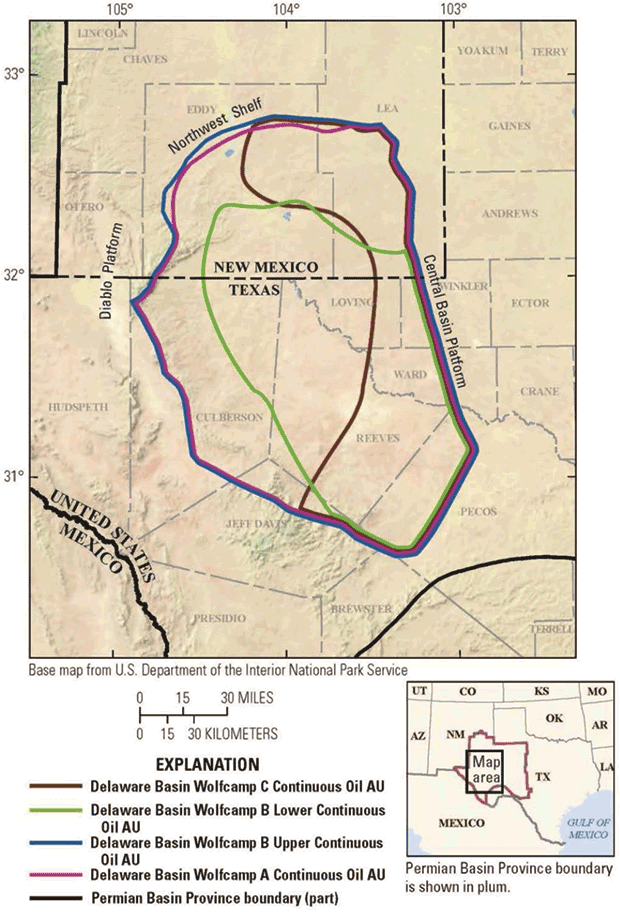 WASHINGTON–The Wolfcamp Shale and overlying Bone Spring formation in the Delaware Basin portion of the Permian Basin contain an estimated 46.3 billion barrels of oil, 281 trillion cubic feet of natural gas, and 20 billion barrels of natural gas liquids, according to a new assessment of the basin’s undiscovered, technically recoverable continuous resources by the U.S. Geological Survey.