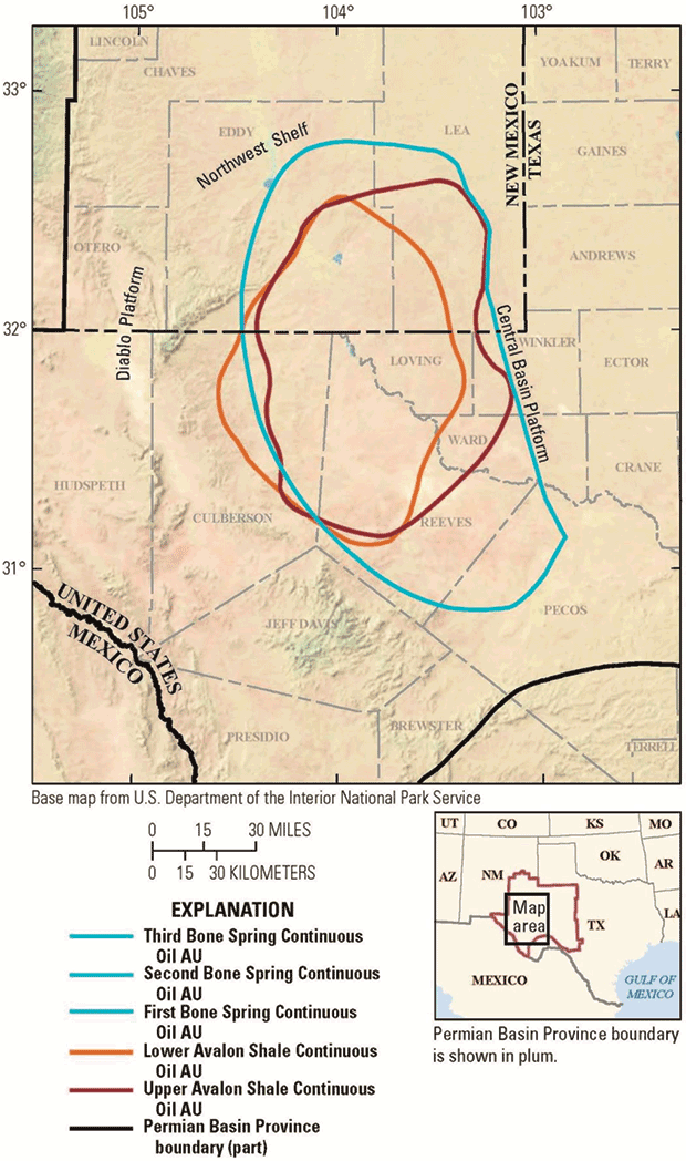 Figures 1 and 2 map the USGS continuous oil assessment units for the Wolfcamp Shale, and the Bone Spring and Avalon shales, respectively. Figure 3 shows the continuous gas assessment units for the Wolfcamp
