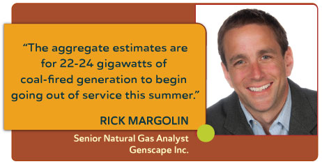 “We still are trying to address the finer points of the planned retirements,” allows Rick Margolin, senior natural gas analyst with Genscape Inc. “The aggregate estimates are for 22-24 gigawatts of coal-fired generation to begin going out of service this summer. But the estimates for that top-line figure vary; the Energy Information Administration’s count is 15 gigawatts, but most others are in the low 20s.”