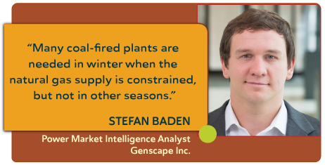 In the northeastern United States, many coal-fired plants are operated seasonally, confirms Stefan Baden, an analyst with Genscape’s New York/New England power market intelligence team. “These plants are needed in winter when the natural gas supply is constrained, but not in other seasons,” he points out.