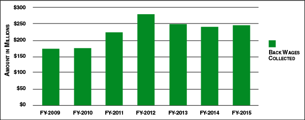 Lawsuits brought under the Fair Labor Standards Act, which governs federal wage and hour law, and related state wage and hour laws continue to rise, and today are the most frequent employment claims filed in federal courts. In fact, 8,954 such lawsuits were brought in 2015, an 11 percent increase from 2014 and a 450 percent increase from 2000. Those settlements resulted in the Department of Labor’s Wage & Hour Division recovering nearly $250 million in back wages for employees (Figure 1), and the combined settlements cost employers $2.5 billion.