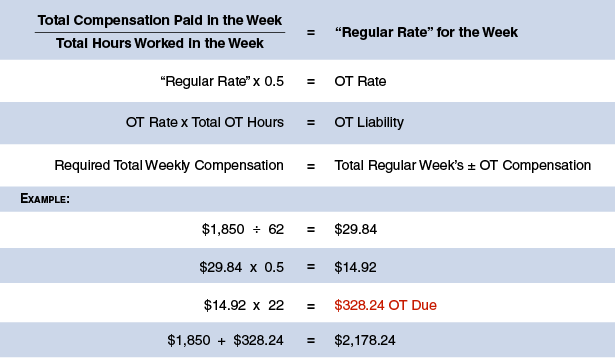The employee’s regular rate for that week then is multiplied by 0.5 to determine the overtime rate, which in turn is multiplied by the hours worked in excess of 40 during the payroll week to yield the overtime payment requirement for that week. Table 1 provides an example of this calculation for a nonexempt employee who earns $1,850 in one week in regular compensation on a day- or shift-rate plan and works a total of 62 hours in that payroll week.