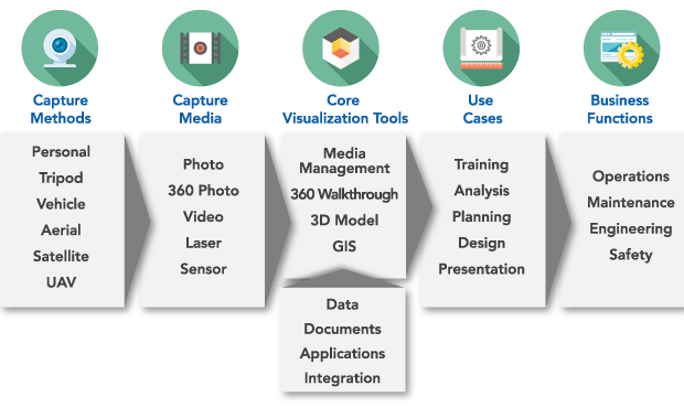 Visualization is the means of organizing, linking and delivering this digital version of assets to workers via the desktop, Web or mobile device in the field. Reality capture is the means to create visualization, which includes everything from simple photos and video to structured capture with 360-degree photogrammetry or laser scanning for creating as-built 3-D models.